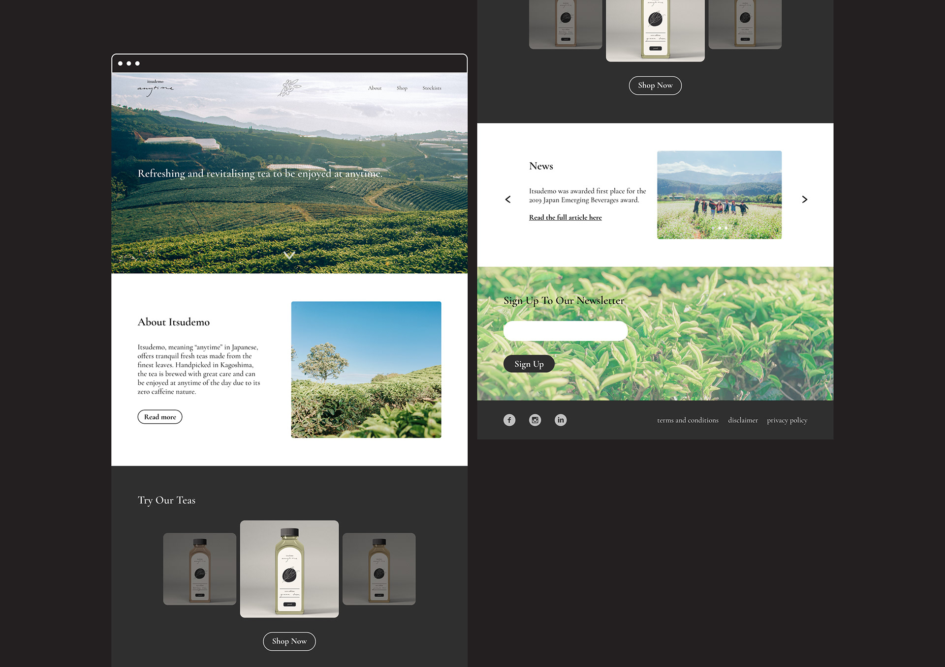 "Itsudemo", meaning anytime in Japanese, is a tea brand for people who appreciate the quiet moments. With its zero caffeine content, Itsudemo lets people enjoy their favourite teas at anytime of the day. Being a brand that aimed to target an international audience, Itsudemo needed an identity which reflected its Japanese origins whilst appealing to a new demographic.