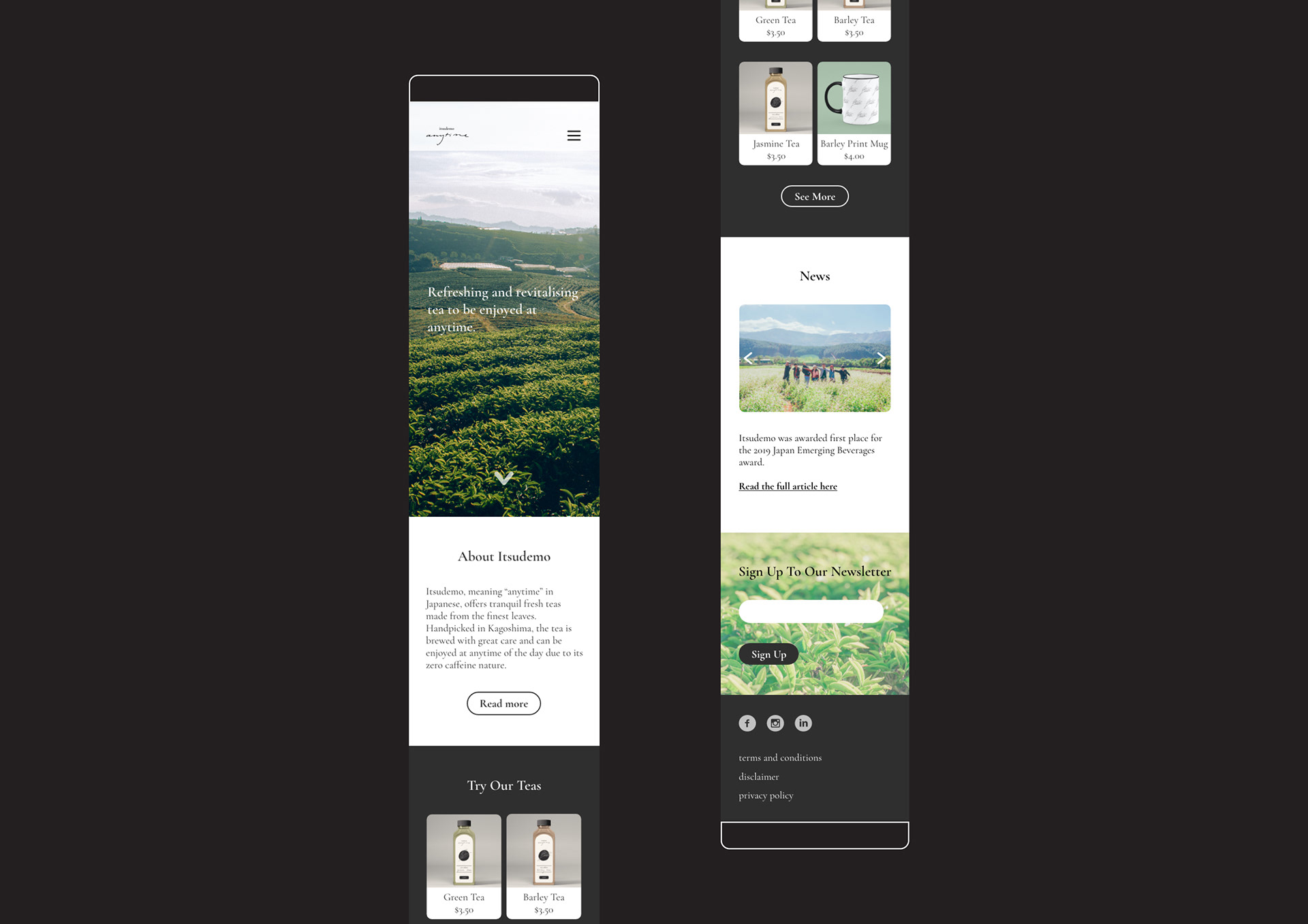 The brand identity includes relaxed, minimal illustrations which pair with an overall clean black and white design. Simplicity and calmness can be felt throughout the Itsudemo identity, reflecting both the tea itself and its origin. The packaging further draws the audience into Itsudemo's story, giving the reader the chance to connect to a new culture.