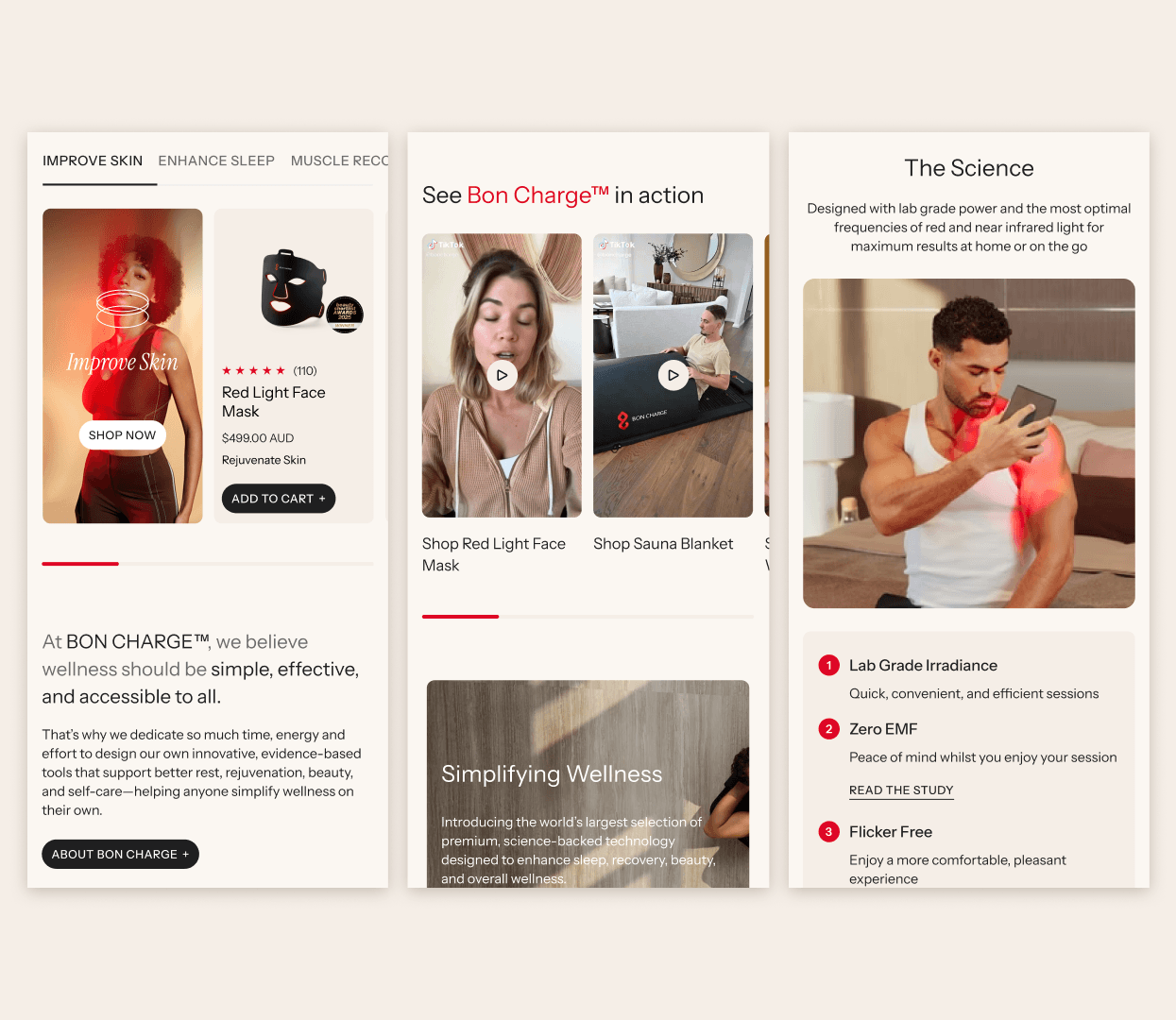 The new brand direction features a warm, inviting colour palette, a modern type pairing, whist bringing the Bon Charge energy. The design was compared against the old site in usability testing, with significant improvements and positive feedback across target demographics. Areas for improvement were highlighted which allowed us to strategise future updates to the site.